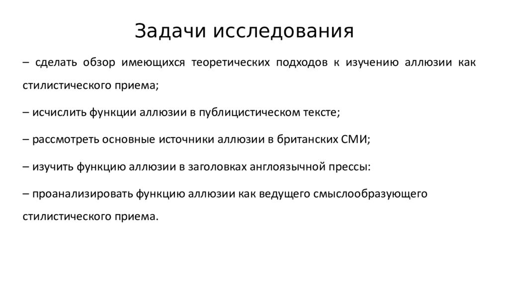 Задачи исследования – сделать обзор имеющихся теоретических подходов к изучению аллюзии как стилистического приема; – исчислить функции аллюзии в публицистическом тексте; – рассмотреть основные источники аллюзии в британских СМИ; – изучить функцию аллюзии в заголовках англоязычной прессы: – проанализировать функцию аллюзии как ведущего смыслообразующего стилистического приема.