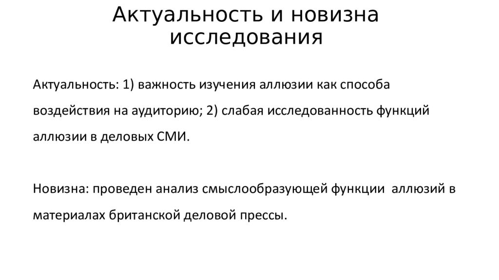 Актуальность и новизна исследования Актуальность: 1) важность изучения аллюзии как способа воздействия на аудиторию; 2) слабая исследованность функций аллюзии в деловых СМИ. Новизна: проведен анализ смыслообразующей функции аллюзий в материалах британской деловой прессы.