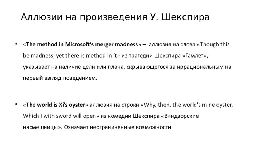 « The method in Microsoft’s merger madness » – аллюзия на слова « Though this be madness, yet there is method in ‘t» из трагедии Шекспира « Гамлет », указывает на наличие цели или плана, скрывающегося за иррациональным на первый взгляд поведением. « The world is Xi ’ s oyster » аллюзия на строки «Why, then, the world's mine oyster, Which I with sword will open» из комедии Шекспира «Виндзорские насмешницы». Означает неограниченные возможности. Аллюзии на произведения У. Шекспира
