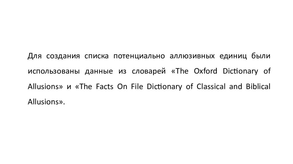 Для создания списка потенциально аллюзивных единиц были использованы данные из словарей « The Oxford Dictionary of Allusions » и « The Facts On File Dictionary of Classical and Biblical Allusions ».