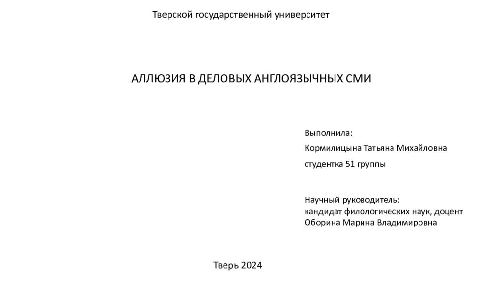 АЛЛЮЗИЯ В ДЕЛОВЫХ АНГЛОЯЗЫЧНЫХ СМИ Выполнила: Кормилицына Татьяна Михайловна студентка 51 группы Научный руководитель: кандидат филологических наук, доцент Оборина Марина Владимировна Тверской государственный университет Тверь 2024