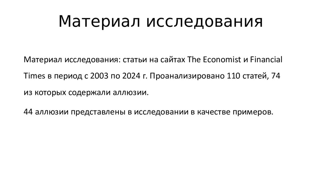Материал исследования Материал исследования: статьи на сайтах The Economist и Financial Times в период с 2003 по 2024 г. П роанализировано 110 статей, 74 из которых содержали аллюзии. 44 аллюзии представлены в исследовании в качестве примеров.