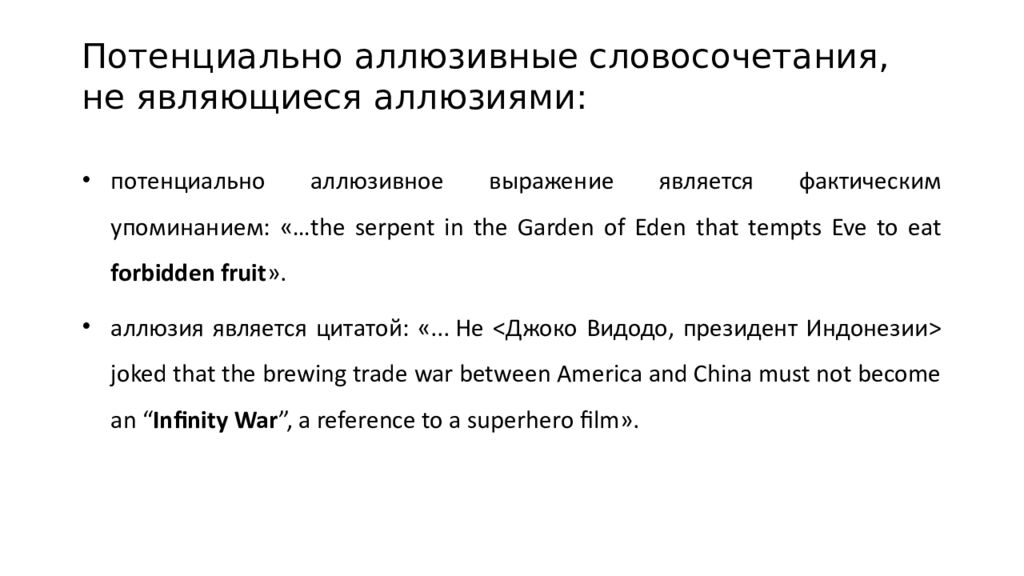 потенциально аллюзивное выражение является фактическим упоминанием: «… the serpent in the Garden of Eden that tempts Eve to eat forbidden fruit ». аллюзия является цитатой: «... He < Джоко Видодо, президент Индонезии > joked that the brewing trade war between America and China must not become an “ Infinity War ”, a reference to a superhero film». Потенциально аллюзивные словосочетания, не являющиеся аллюзиями: