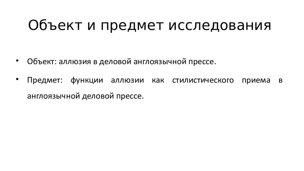 Объект и предмет исследования Объект: аллюзия в деловой англоязычной прессе. Предмет: функции аллюзии как стилистического приема в англоязычной деловой прессе.