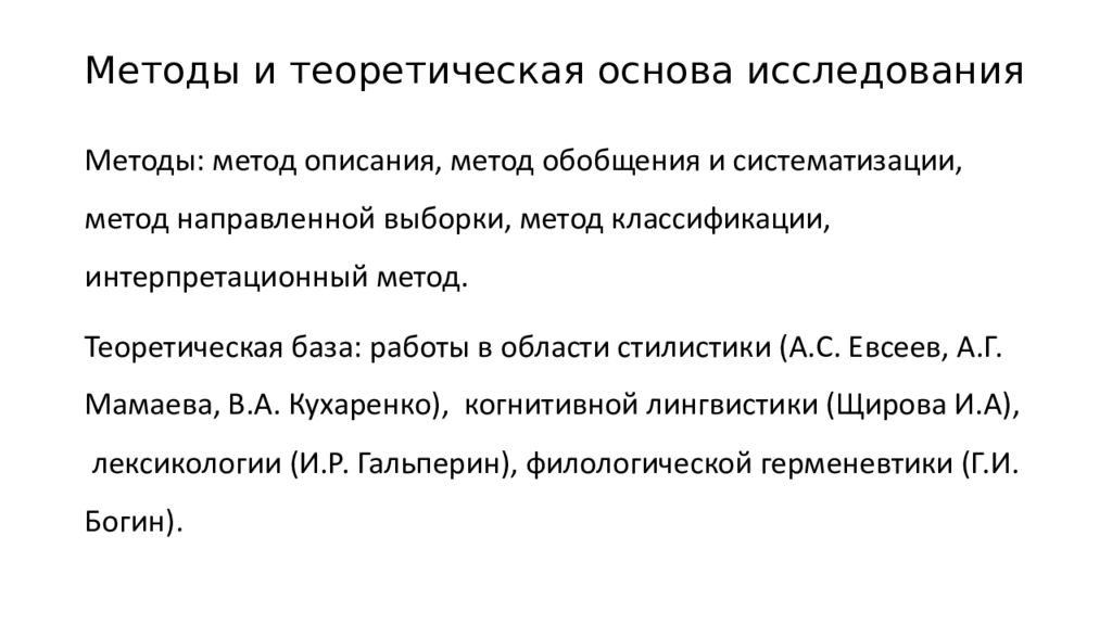 Методы и теоретическая основа исследования Методы: метод описания, метод обобщения и систематизации, метод направленной выборки, метод классификации, интерпретационный метод. Теоретическая база: работы в области стилистики (А.С. Евсеев, А.Г. Мамаева, В.А. Кухаренко), когнитивной лингвистики ( Щирова И.А), лексикологии (И.Р. Гальперин), филологической герменевтики (Г.И. Богин ).
