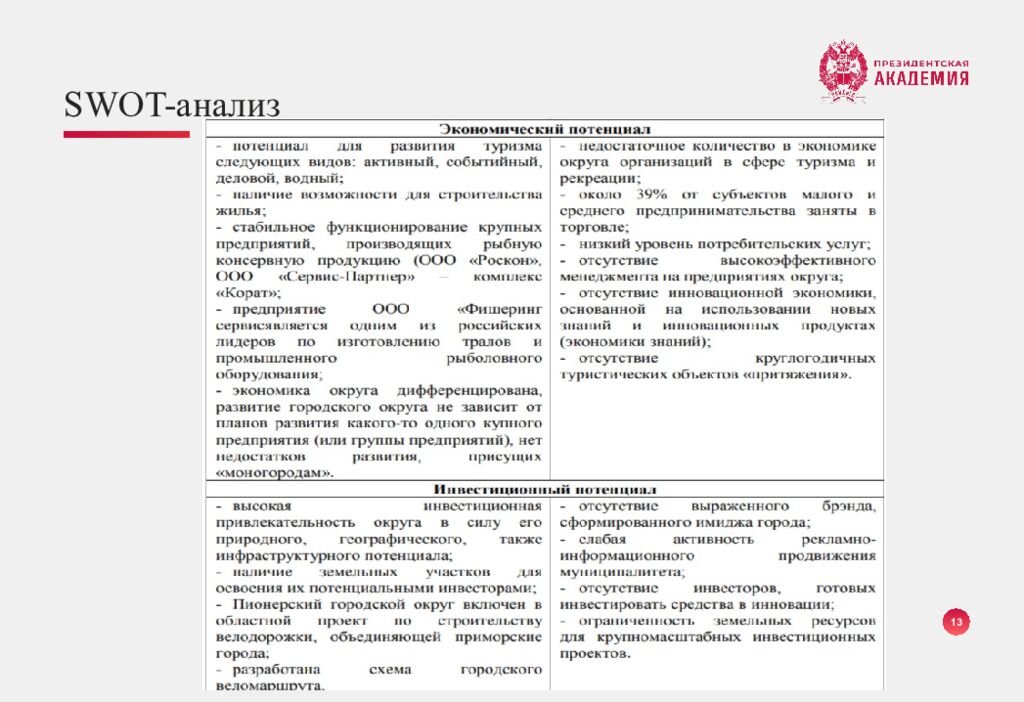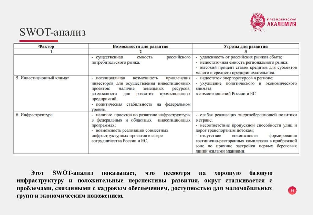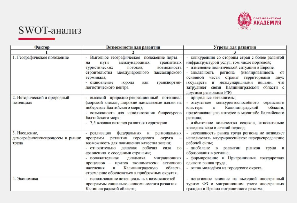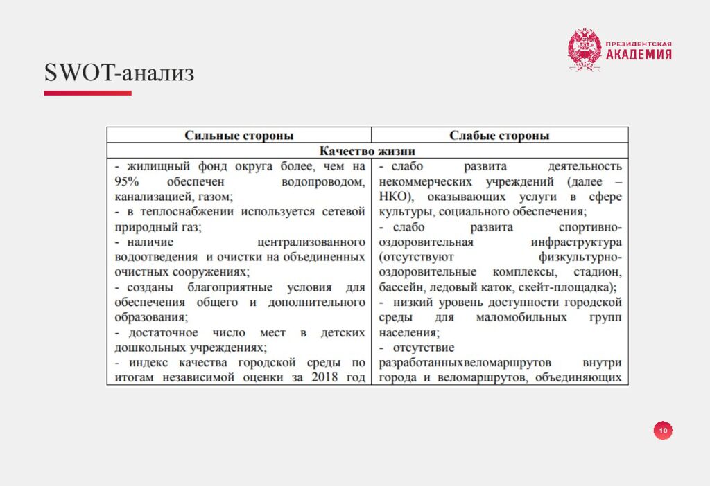 SWOT- анализ Этот SWOT-анализ показывает, что несмотря на хорошую базовую инфраструктуру и положительные перспективы развития, округ сталкивается с проблемами, связанными с кадровым обеспечением, доступностью для маломобильных групп и экономическим положением.