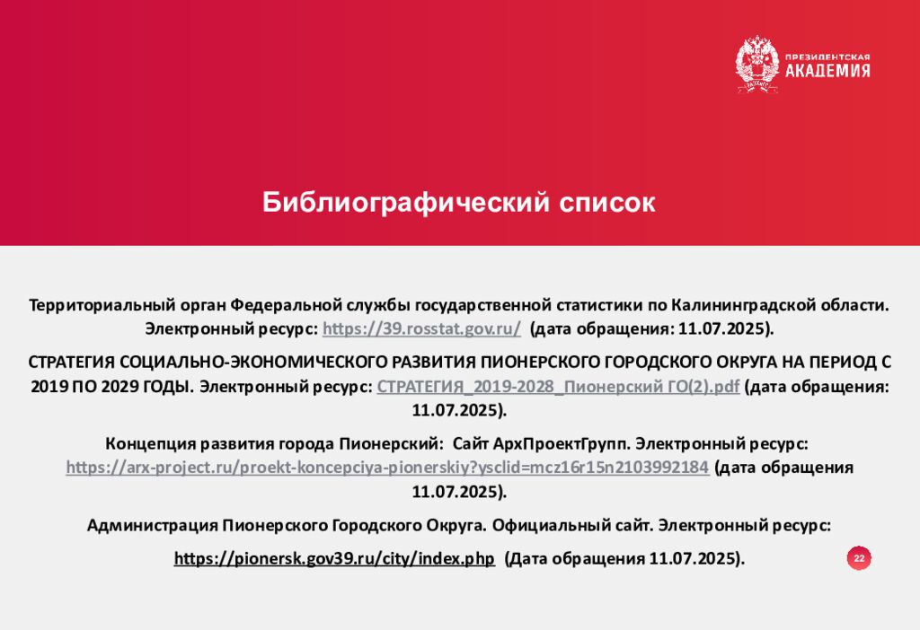 Библиографический список Территориальный орган Федеральной службы государственной статистики по Калининградской области. Электронный ресурс: https://39.rosstat.gov.ru/ (дата обращения: 11.07.2025). СТРАТЕГИЯ СОЦИАЛЬНО-ЭКОНОМИЧЕСКОГО РАЗВИТИЯ ПИОНЕРСКОГО ГОРОДСКОГО ОКРУГА НА ПЕРИОД С 2019 ПО 2029 ГОДЫ. Электронный ресурс: СТРАТЕГИЯ_2019-2028_Пионерский ГО(2).pdf (дата обращения: 11.07.2025). Концепция развития города Пионерский: Сайт АрхПроектГрупп. Электронный ресурс: https://arx-project.ru/proekt-koncepciya-pionerskiy?ysclid=mcz16r15n2103992184 (дата обращения 11.07.2025). Администрация Пионерского Городского Округа. Официальный сайт. Электронный ресурс: https://pionersk.gov39.ru/city/index.php (Дата обращения 11.07.2025).