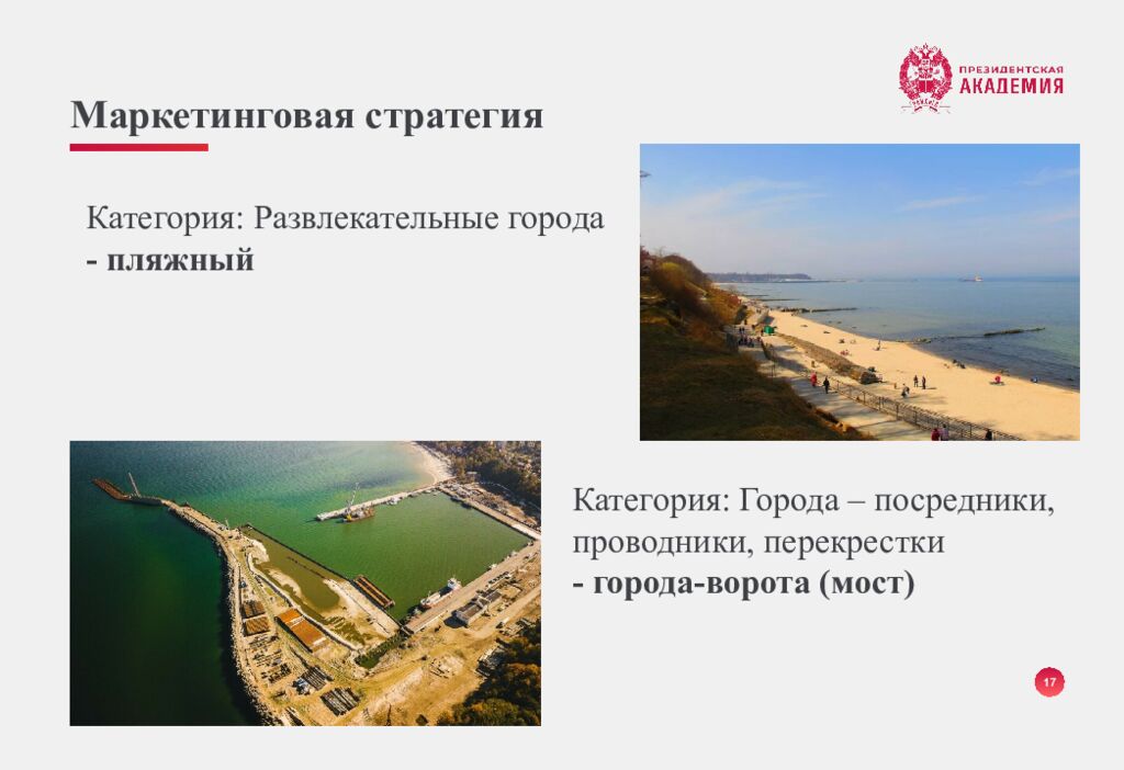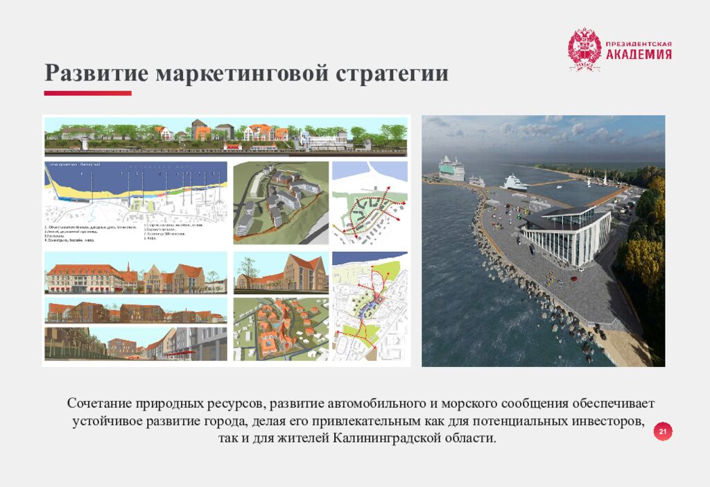Развитие маркетинговой стратегии Сочетание природных ресурсов, развитие автомобильного и морского сообщения обеспечивает устойчивое развитие города, делая его привлекательным как для потенциальных инвесторов, так и для жителей Калининградской области.