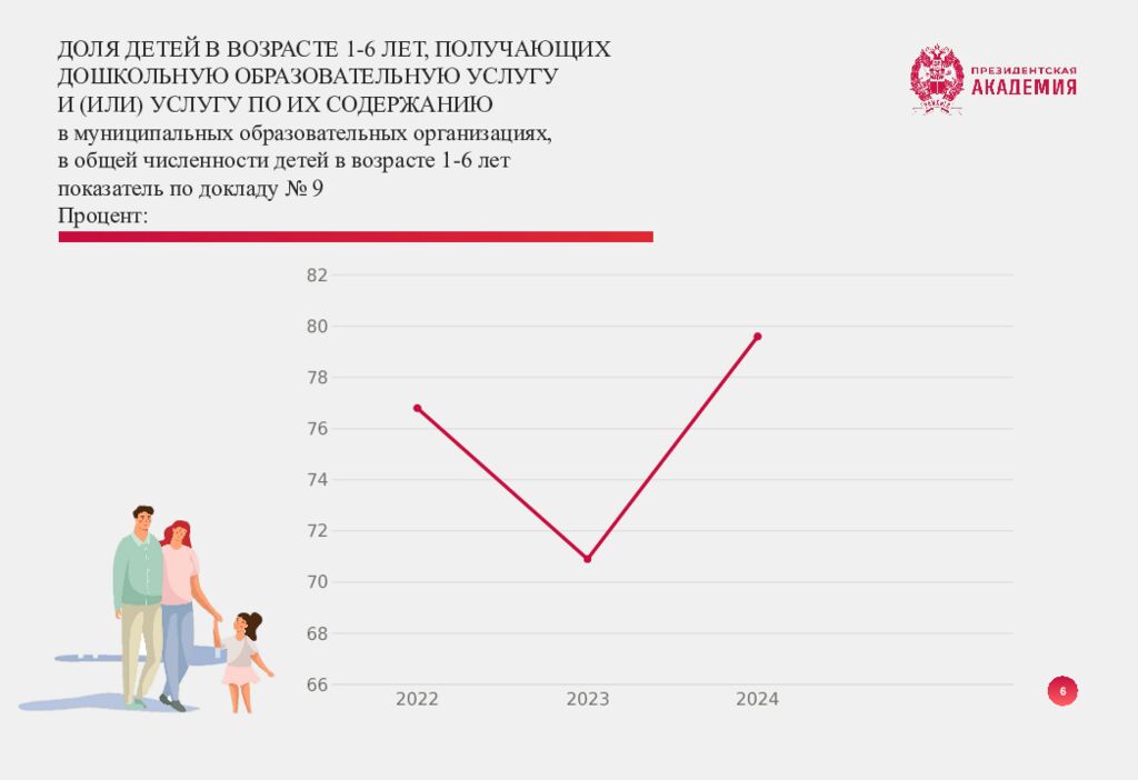 ДОЛЯ ДЕТЕЙ В ВОЗРАСТЕ 1-6 ЛЕТ, ПОЛУЧАЮЩИХ ДОШКОЛЬНУЮ ОБРАЗОВАТЕЛЬНУЮ УСЛУГУ И (ИЛИ) УСЛУГУ ПО ИХ СОДЕРЖАНИЮ в муниципальных образовательных организациях, в общей численности детей в возрасте 1-6 лет показатель по докладу № 9 Процент:
