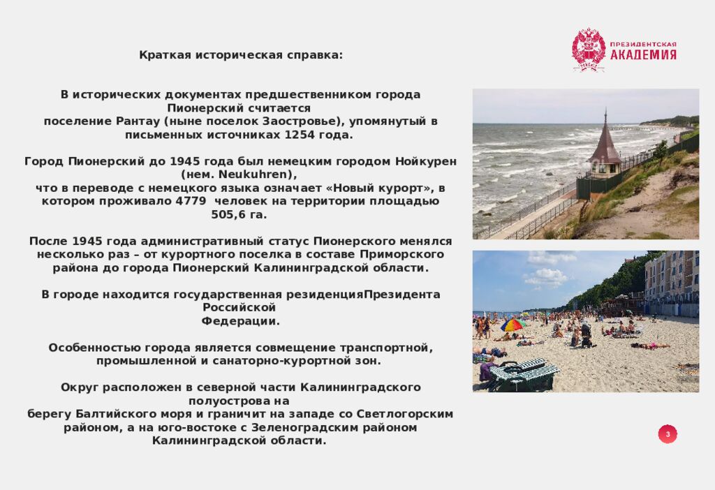 Краткая историческая справка: В исторических документах предшественником города Пионерский считается поселение Рантау (ныне поселок Заостровье), упомянутый в письменных источниках 1254 года. Город Пионерский до 1945 года был немецким городом Нойкурен (нем. Neukuhren ), что в переводе с немецкого языка означает «Новый курорт», в котором проживало 4779 человек на территории площадью 505,6 га. После 1945 года административный статус Пионерского менялся несколько раз – от курортного поселка в составе Приморского района до города Пионерский Калининградской области. В городе находится государственная резиденцияПрезидента Российской Федерации. Особенностью города является совмещение транспортной, промышленной и санаторно-курортной зон. Округ расположен в северной части Калининградского полуострова на берегу Балтийского моря и граничит на западе со Светлогорским районом, а на юго-востоке с Зеленоградским районом Калининградской области.