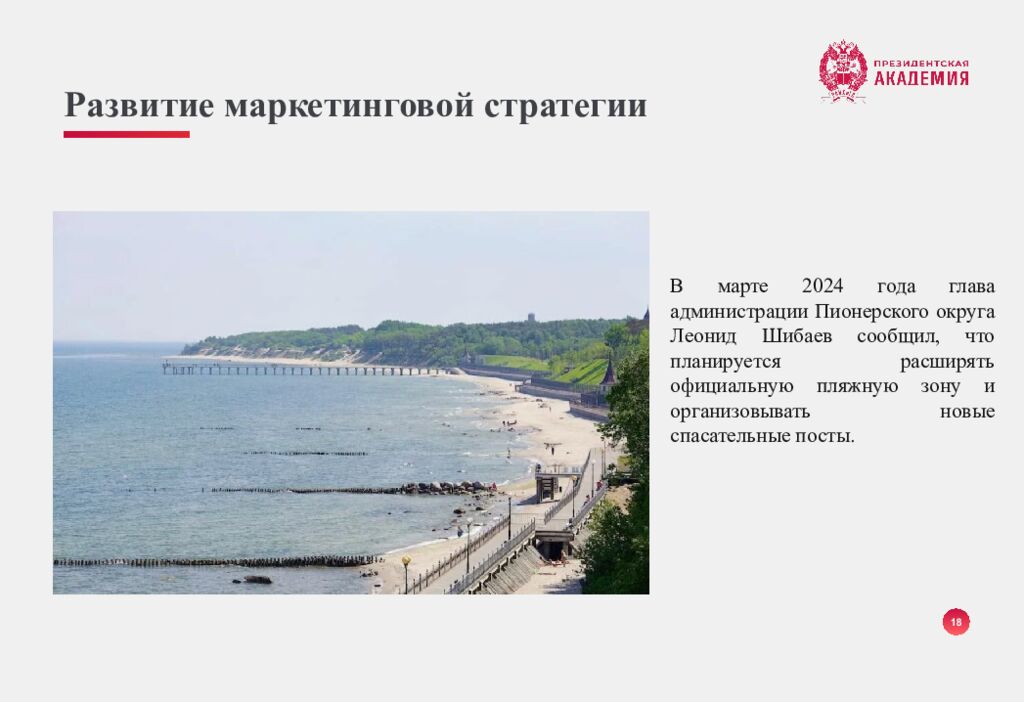 Развитие маркетинговой стратегии В марте 2024 года глава администрации Пионерского округа Леонид Шибаев сообщил, что планируется расширять официальную пляжную зону и организовывать новые спасательные посты.