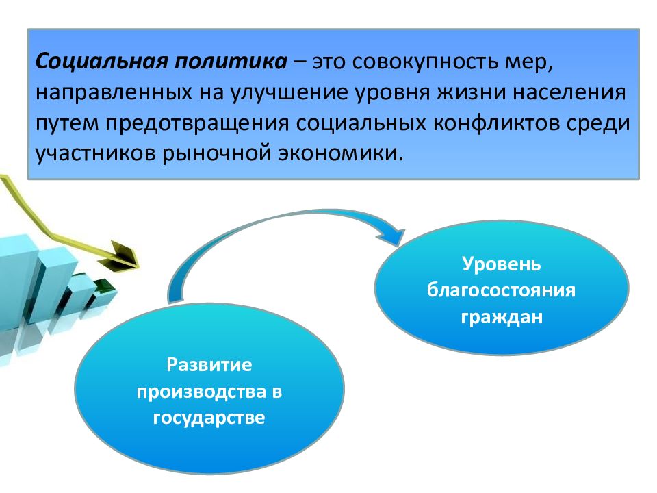 Социальная политика – это совокупность мер, направленных на улучшение уровня жизни населения путем предотвращения социальных конфликтов среди участников рыночной экономики. Развитие производства в государстве Уровень благосостояния граждан