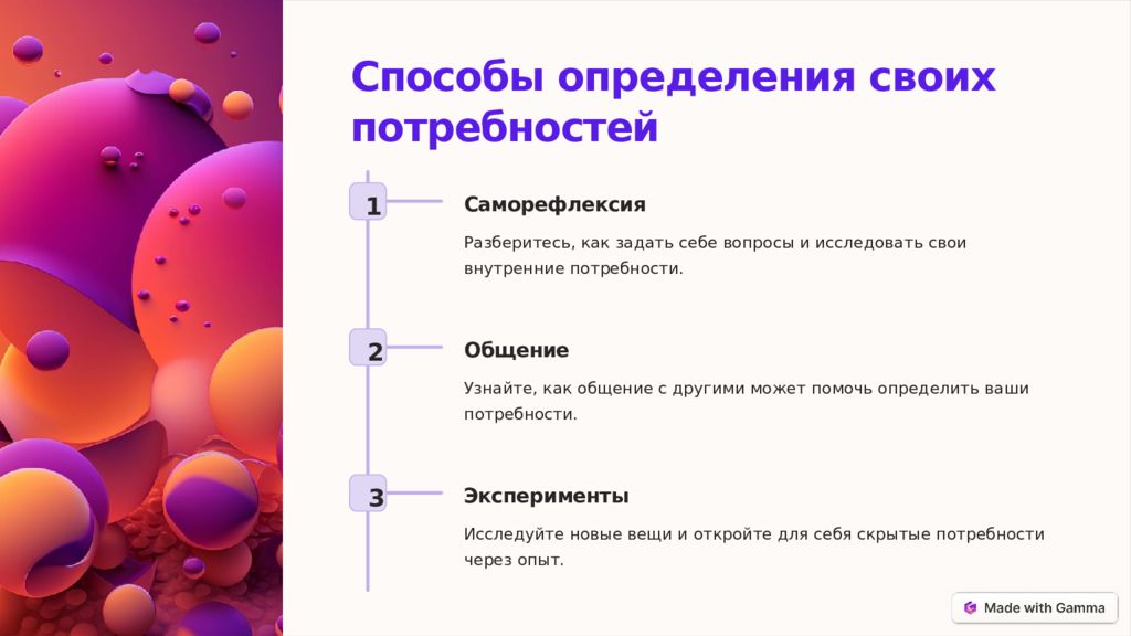Способы определения своих потребностей 1 Саморефлексия Разберитесь, как задать себе вопросы и исследовать свои внутренние потребности. 2 Общение Узнайте, как общение с другими может помочь определить ваши потребности. 3 Эксперименты Исследуйте новые вещи и откройте для себя скрытые потребности через опыт.