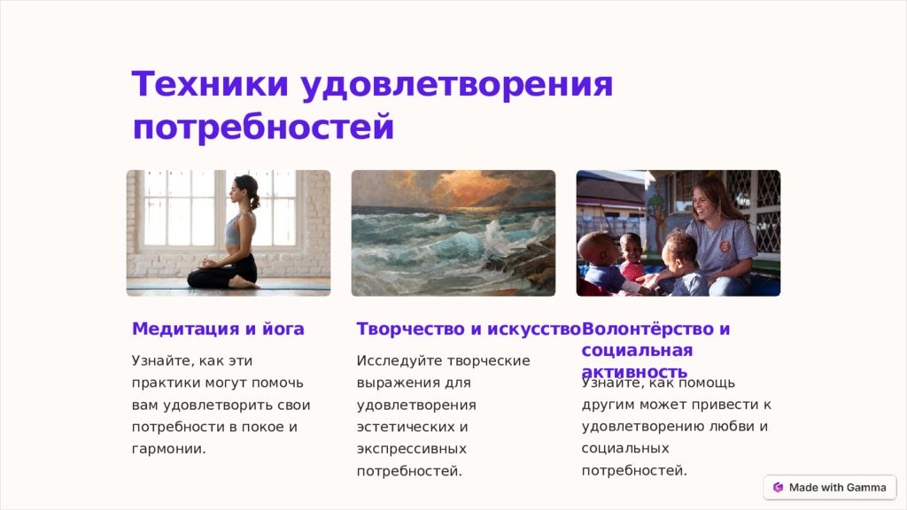 Техники удовлетворения потребностей Медитация и йога Узнайте, как эти практики могут помочь вам удовлетворить свои потребности в покое и гармонии. Творчество и искусство Исследуйте творческие выражения для удовлетворения эстетических и экспрессивных потребностей. Волонтёрство и социальная активность Узнайте, как помощь другим может привести к удовлетворению любви и социальных потребностей.