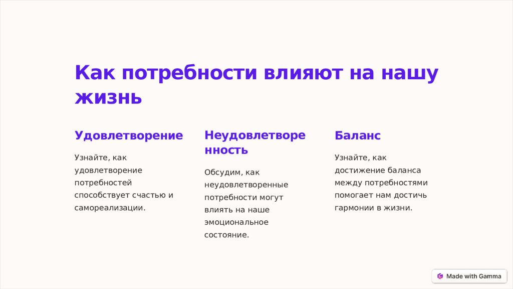 Как потребности влияют на нашу жизнь Удовлетворение Узнайте, как удовлетворение потребностей способствует счастью и самореализации. Неудовлетворенность Обсудим, как неудовлетворенные потребности могут влиять на наше эмоциональное состояние. Баланс Узнайте, как достижение баланса между потребностями помогает нам достичь гармонии в жизни.