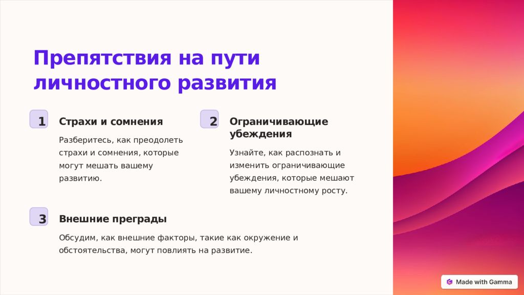 Препятствия на пути личностного развития 1 Страхи и сомнения Разберитесь, как преодолеть страхи и сомнения, которые могут мешать вашему развитию. 2 Ограничивающие убеждения Узнайте, как распознать и изменить ограничивающие убеждения, которые мешают вашему личностному росту. 3 Внешние преграды Обсудим, как внешние факторы, такие как окружение и обстоятельства, могут повлиять на развитие.