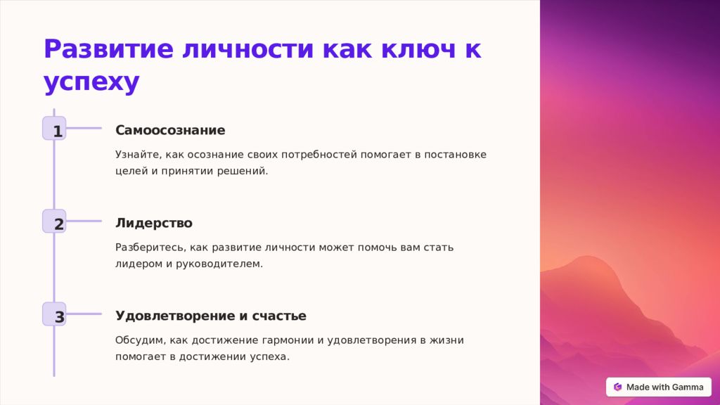 Развитие личности как ключ к успеху 1 Самоосознание Узнайте, как осознание своих потребностей помогает в постановке целей и принятии решений. 2 Лидерство Разберитесь, как развитие личности может помочь вам стать лидером и руководителем. 3 Удовлетворение и счастье Обсудим, как достижение гармонии и удовлетворения в жизни помогает в достижении успеха.