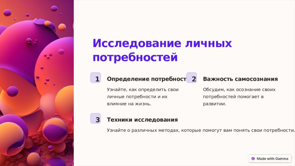 Исследование личных потребностей 1 Определение потребностей Узнайте, как определить свои личные потребности и их влияние на жизнь. 2 Важность самосознания Обсудим, как осознание своих потребностей помогает в развитии. 3 Техники исследования Узнайте о различных методах, которые помогут вам понять свои потребности.