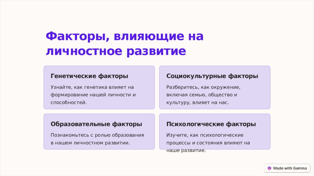 Факторы, влияющие на личностное развитие Генетические факторы Узнайте, как генетика влияет на формирование нашей личности и способностей. Социокультурные факторы Разберитесь, как окружение, включая семью, общество и культуру, влияет на нас. Образовательные факторы Познакомьтесь с ролью образования в нашем личностном развитии. Психологические факторы Изучите, как психологические процессы и состояния влияют на наше развитие.