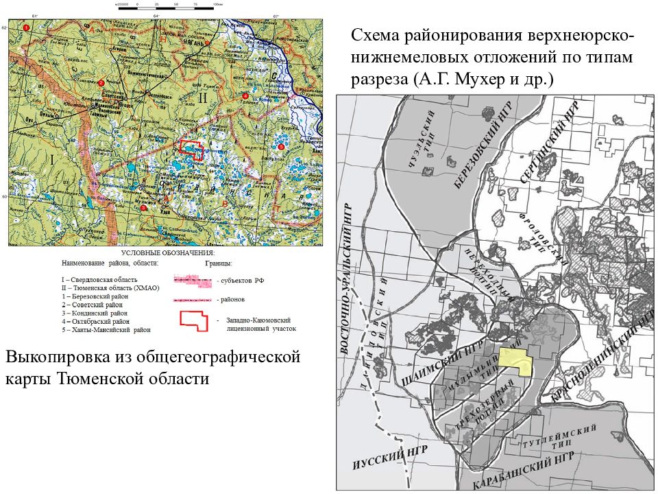Выкопировка из общегеографической карты Тюменской области Схема районирования верхнеюрско-нижнемеловых отложений по типам разреза (А.Г. Мухер и др.)