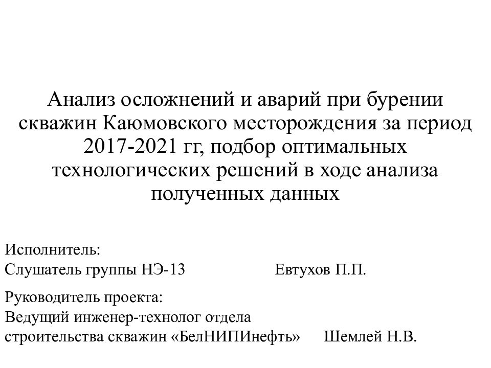 Первый слайд презентации: Анализ осложнений и аварий при бурении скважин Каюмовского месторождения за период 2017-2021 гг, подбор оптимальных технологических решений в ходе анализа полученных данных