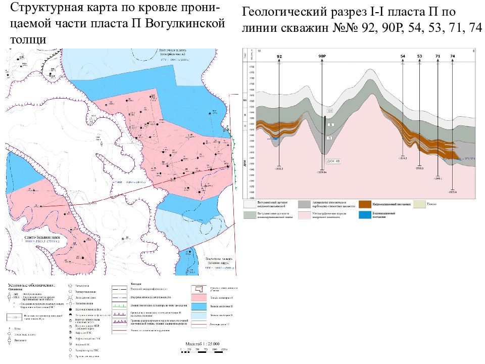 Структурная карта по кровле прони-цаемой части пласта П Вогулкинской толщи Геологический разрез I-I пласта П по линии скважин №№ 92, 90Р, 54, 53, 71, 74