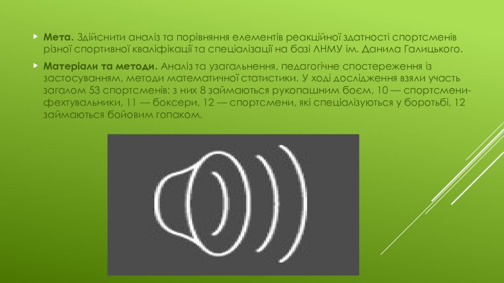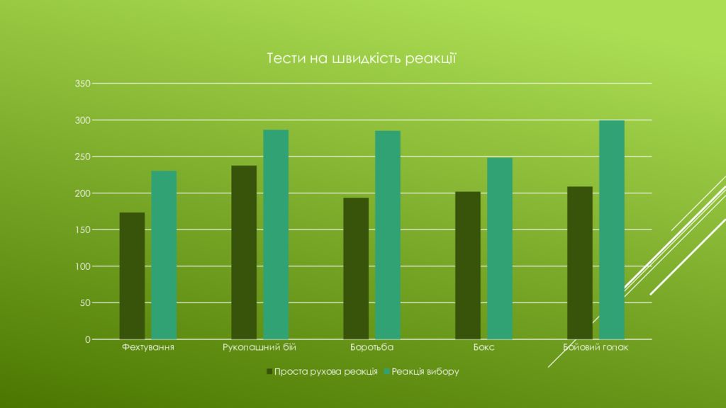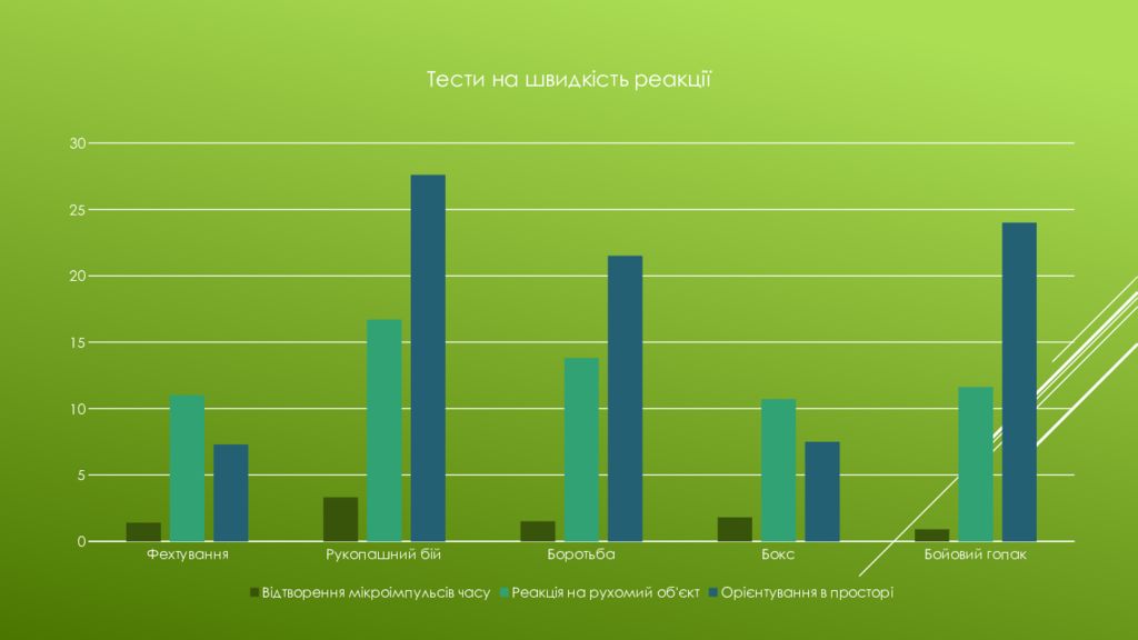 Мета. Здійснити аналіз та порівняння елементів реакційної здатності спортсменів різної спортивної кваліфікації та спеціалізації на базі ЛНМУ ім. Данила Галицького. Матеріали та методи. Аналіз та узагальнення, педагогічне спостереження із застосуванням, методи математичної статистики. У ході дослідження взяли участь загалом 53 спортсменів : з них 8 займаються рукопашним боєм, 10 — спортсмени-фехтувальники, 11 — боксери, 12 — спортсмени, які спеціалізуються у боротьбі, 12 займаються бойовим гопаком.
