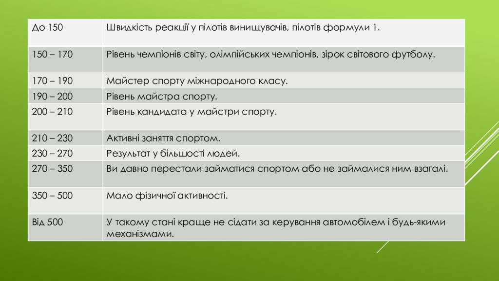 До 150 Швидкість реакції у пілотів винищувачів, пілотів формули 1. 150 – 170 Рівень чемпіонів світу, олімпійських чемпіонів, зірок світового футболу. 170 – 190 Майстер спорту міжнародного класу. 190 – 200 Рівень майстра спорту. 200 – 210 Рівень кандидата у майстри спорту. 210 – 230 Активні заняття спортом. 230 – 270 Результат у більшості людей. 270 – 350 Ви давно перестали займатися спортом або не займалися ним взагалі. 350 – 500 Мало фізичної активності. Від 500 У такому стані краще не сідати за керування автомобілем і будь-якими механізмами.