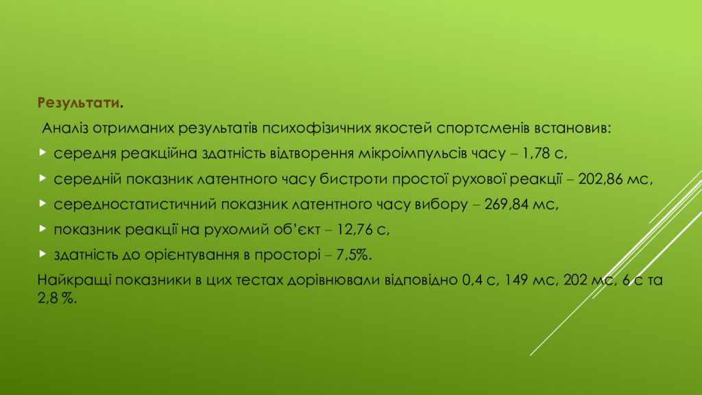 Результати. Аналіз отриманих результатів психофізичних якостей спортсменів встановив: середня реакційна здатність відтворення мікроімпульсів часу – 1,78 с, середній показник латентного часу бистроти простої рухової реакції – 202,86 мс, середностатистичний показник латентного часу вибору – 269,84 мс, п оказник реакції на рухомий об’єкт – 12,76 с, з датність до орієнтування в просторі – 7,5%. Найкращі показники в цих тестах дорівнювали відповідно 0,4 с, 149 мс, 202 мс, 6 с та 2,8 %.