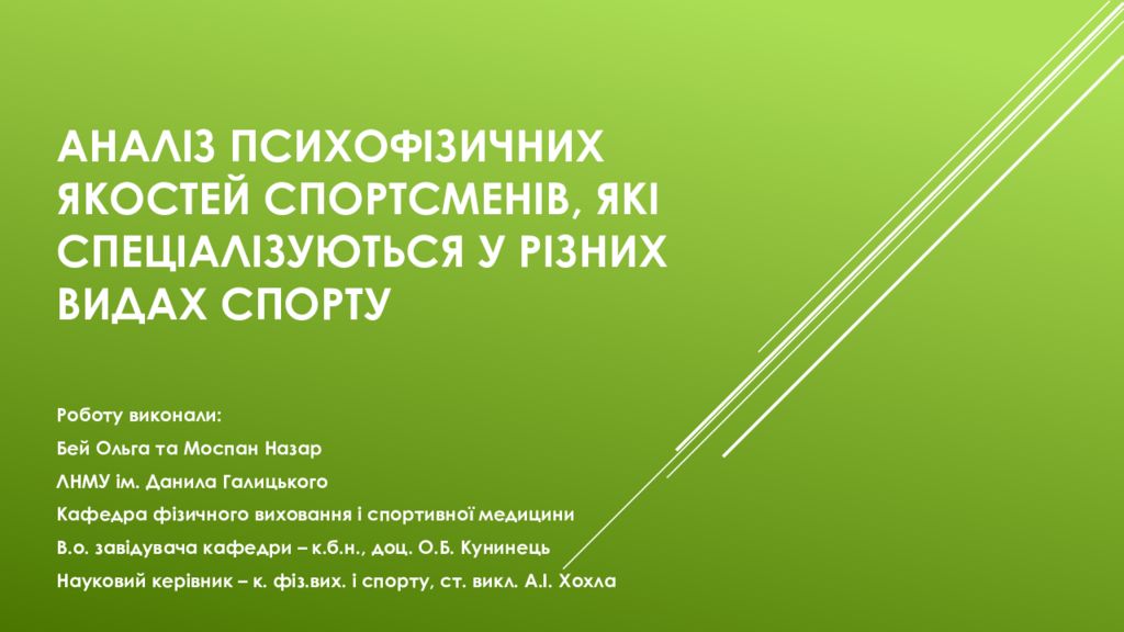 Первый слайд презентации: АНАЛІЗ ПСИХОФІЗИЧНИХ ЯКОСТЕЙ СПОРТСМЕНІВ, ЯКІ СПЕЦІАЛІЗУЮТЬСЯ У РІЗНИХ ВИДАХ СПОРТУ