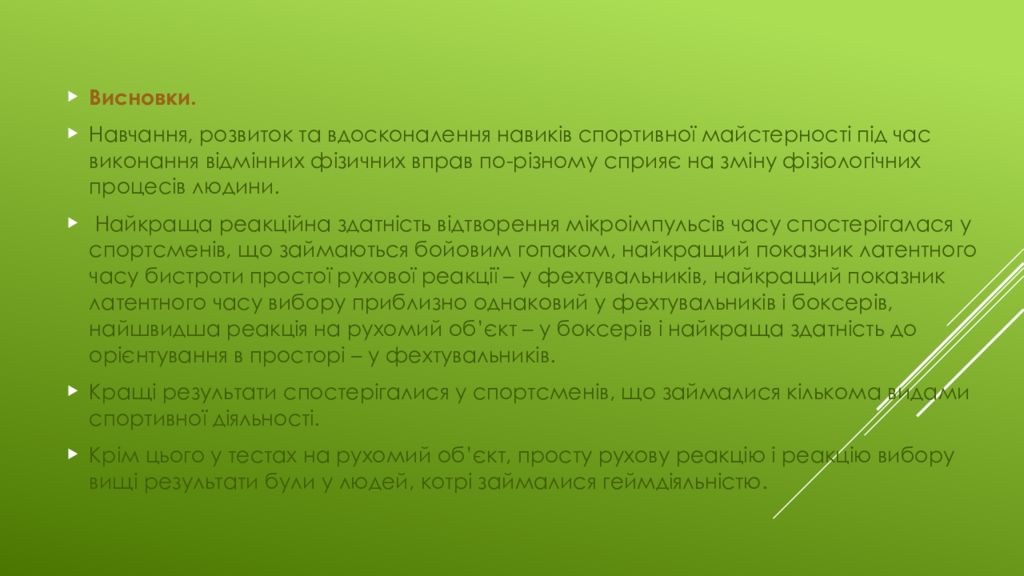 Висновки. Навчання, розвиток та вдосконалення навиків спортивної майстерності під час виконання відмінних фізичних вправ по-різному сприяє на зміну фізіологічних процесів людини. Н айкраща реакційна здатність відтворення мікроімпульсів часу спостерігалася у спортсменів, що займаються бойовим гопаком, найкращий показник латентного часу бистроти простої рухової реакції – у фехтувальників, найкращий показник латентного часу вибору приблизно однаковий у фехтувальників і боксерів, найшвидша реакція на рухомий об’єкт – у боксерів і найкраща здатність до орієнтування в просторі – у фехтувальників. Кращі результати спостерігалися у спортсменів, що займалися кількома видами спортивної діяльності. Крім цього у тестах на рухомий об ’ єкт, просту рухову реакцію і реакцію вибору вищі результати були у людей, котрі займалися геймдіяльністю.
