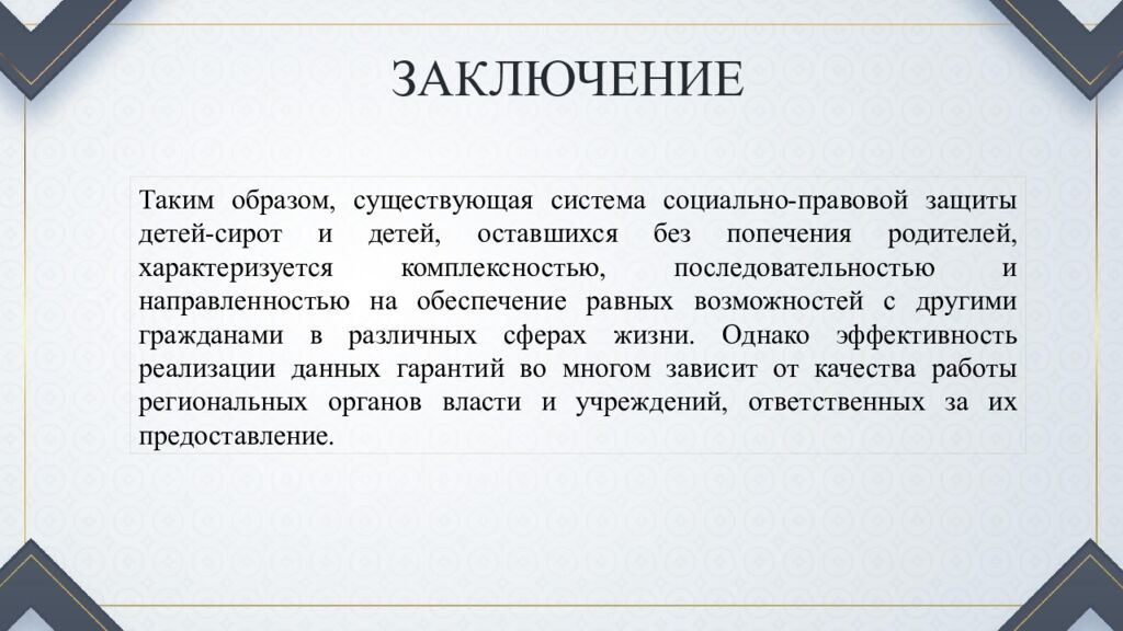 Таким образом, существующая система социально-правовой защиты детей-сирот и детей, оставшихся без попечения родителей, характеризуется комплексностью, последовательностью и направленностью на обеспечение равных возможностей с другими гражданами в различных сферах жизни. Однако эффективность реализации данных гарантий во многом зависит от качества работы региональных органов власти и учреждений, ответственных за их предоставление.
