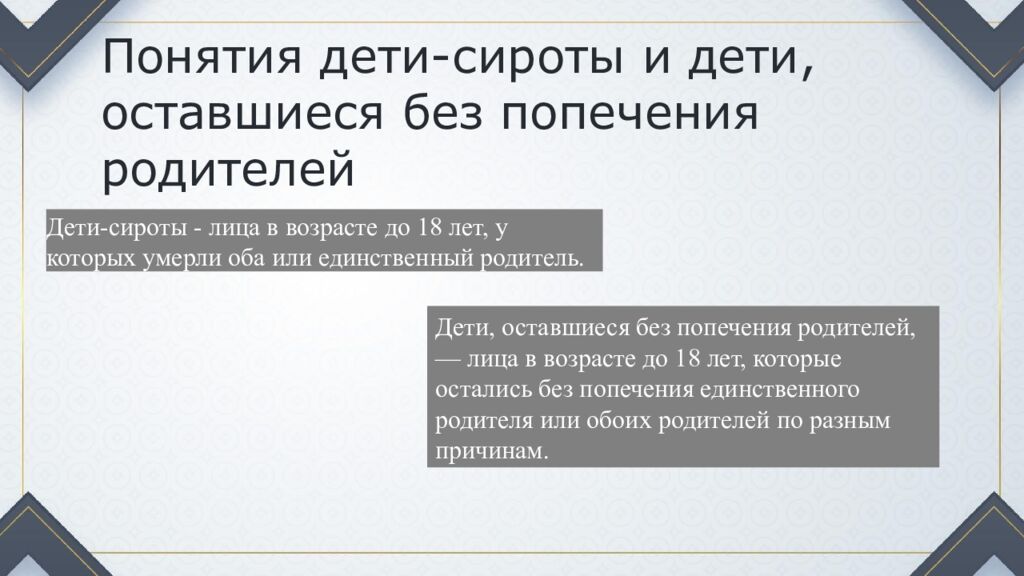 Дети-сироты - лица в возрасте до 18 лет, у которых умерли оба или единственный родитель. Дети, оставшиеся без попечения родителей, — лица в возрасте до 18 лет, которые остались без попечения единственного родителя или обоих родителей по разным причинам.