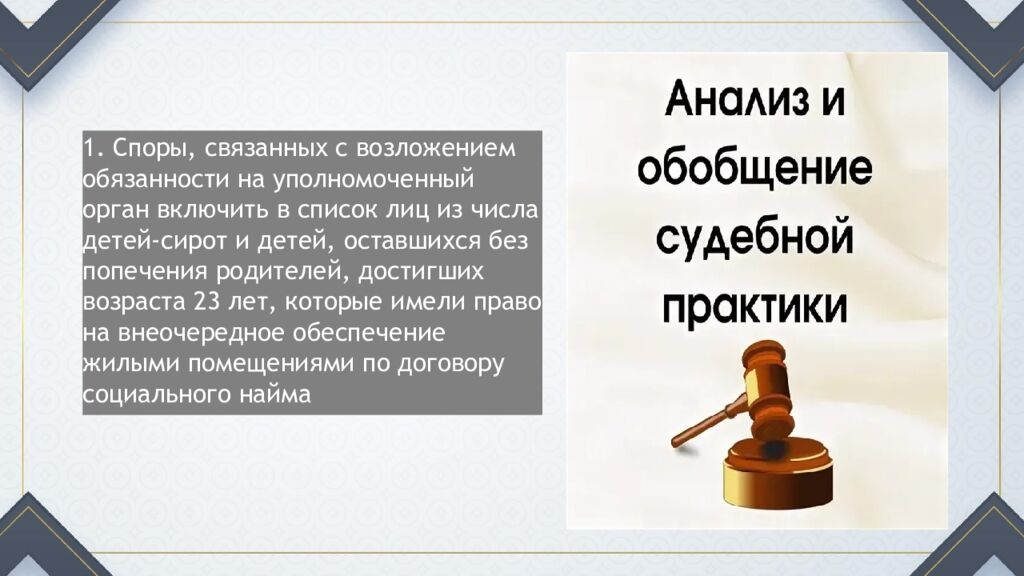 1. Споры, связанных с возложением обязанности на уполномоченный орган включить в список лиц из числа детей-сирот и детей, оставшихся без попечения родителей, достигших возраста 23 лет, которые имели право на внеочередное обеспечение жилыми помещениями по договору социального найма