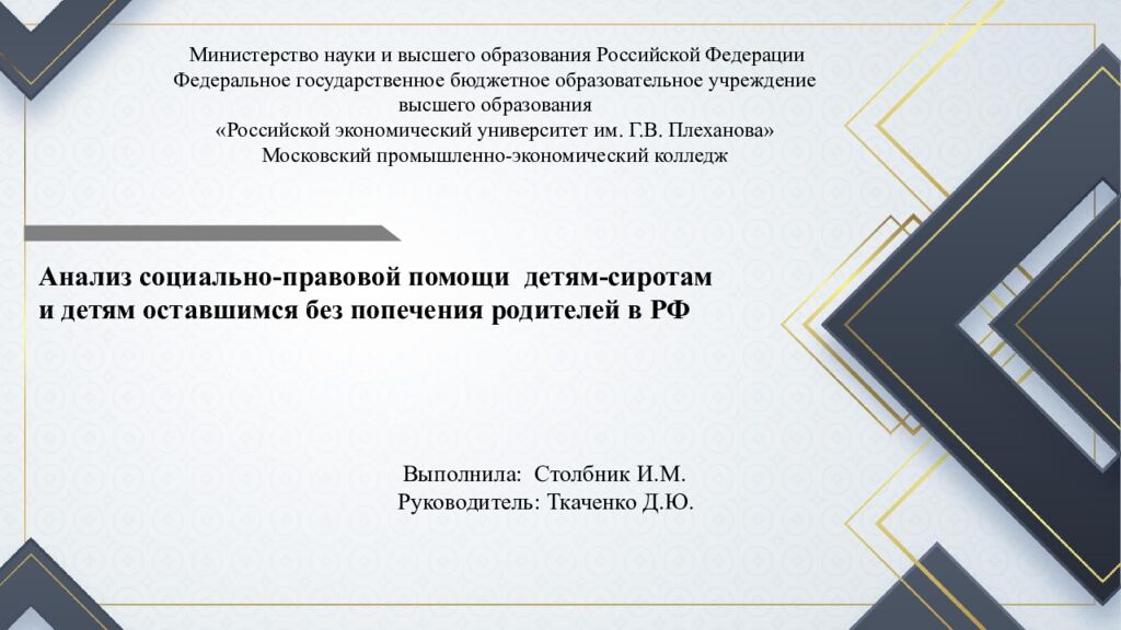 Анализ социально-правовой помощи детям-сиротам и детям оставшимся без попечения родителей в РФ Министерство науки и высшего образования Российской Федерации Федеральное государственное бюджетное образовательное учреждение высшего образования «Российской экономический университет им. Г.В. Плеханова» Московский промышленно-экономический колледж Выполнила: Столбник И.М. Руководитель: Ткаченко Д.Ю.