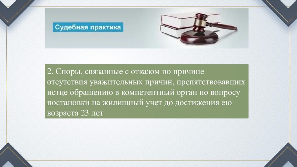 2. Споры, связанные с отказом по причине отсутствия уважительных причин, препятствовавших истце обращению в компетентный орган по вопросу постановки на жилищный учет до достижения ею возраста 23 лет