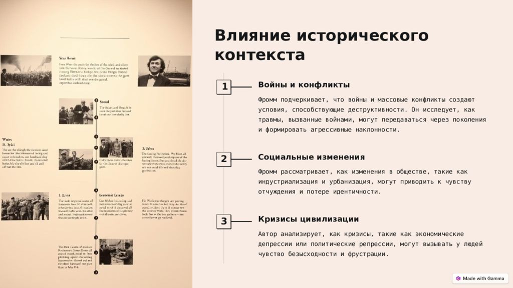 Влияние исторического контекста 1 Войны и конфликты Фромм подчеркивает, что войны и массовые конфликты создают условия, способствующие деструктивности. Он исследует, как травмы, вызванные войнами, могут передаваться через поколения и формировать агрессивные наклонности. 2 Социальные изменения Фромм рассматривает, как изменения в обществе, такие как индустриализация и урбанизация, могут приводить к чувству отчуждения и потере идентичности. 3 Кризисы цивилизации Автор анализирует, как кризисы, такие как экономические депрессии или политические репрессии, могут вызывать у людей чувство безысходности и фрустрации.