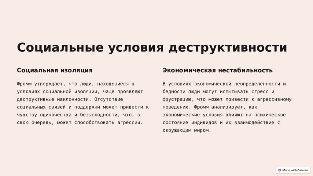 Социальные условия деструктивности Социальная изоляция Фромм утверждает, что люди, находящиеся в условиях социальной изоляции, чаще проявляют деструктивные наклонности. Отсутствие социальных связей и поддержки может привести к чувству одиночества и безысходности, что, в свою очередь, может способствовать агрессии. Экономическая нестабильность В условиях экономической неопределенности и бедности люди могут испытывать стресс и фрустрацию, что может привести к агрессивному поведению. Фромм анализирует, как экономические условия влияют на психическое состояние индивидов и их взаимодействие с окружающим миром.
