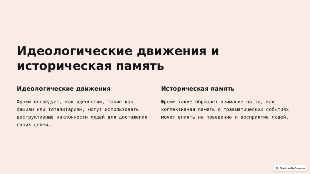 Идеологические движения и историческая память Идеологические движения Фромм исследует, как идеологии, такие как фашизм или тоталитаризм, могут использовать деструктивные наклонности людей для достижения своих целей. Историческая память Фромм также обращает внимание на то, как коллективная память о травматических событиях может влиять на поведение и восприятие людей.