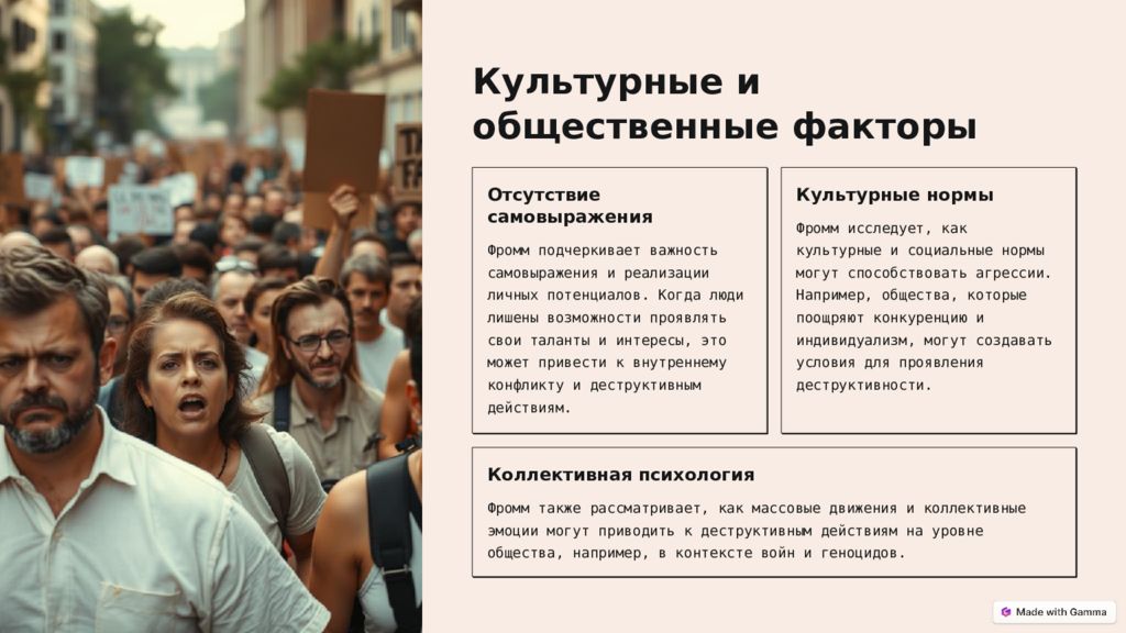 Культурные и общественные факторы Отсутствие самовыражения Фромм подчеркивает важность самовыражения и реализации личных потенциалов. Когда люди лишены возможности проявлять свои таланты и интересы, это может привести к внутреннему конфликту и деструктивным действиям. Культурные нормы Фромм исследует, как культурные и социальные нормы могут способствовать агрессии. Например, общества, которые поощряют конкуренцию и индивидуализм, могут создавать условия для проявления деструктивности. Коллективная психология Фромм также рассматривает, как массовые движения и коллективные эмоции могут приводить к деструктивным действиям на уровне общества, например, в контексте войн и геноцидов.