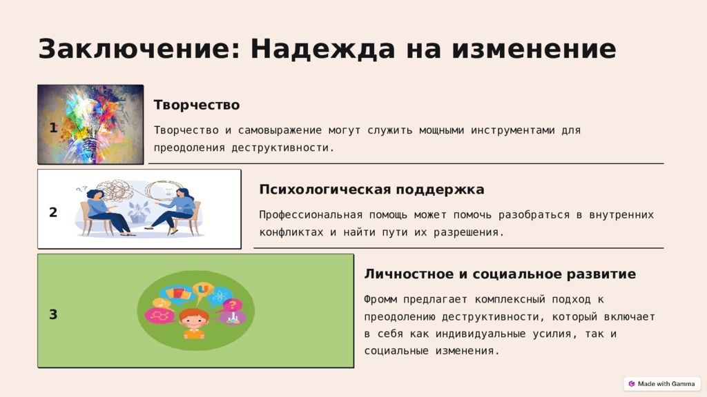 Заключение: Надежда на изменение 1 Творчество Творчество и самовыражение могут служить мощными инструментами для преодоления деструктивности. 2 Психологическая поддержка Профессиональная помощь может помочь разобраться в внутренних конфликтах и найти пути их разрешения. 3 Личностное и социальное развитие Фромм предлагает комплексный подход к преодолению деструктивности, который включает в себя как индивидуальные усилия, так и социальные изменения.