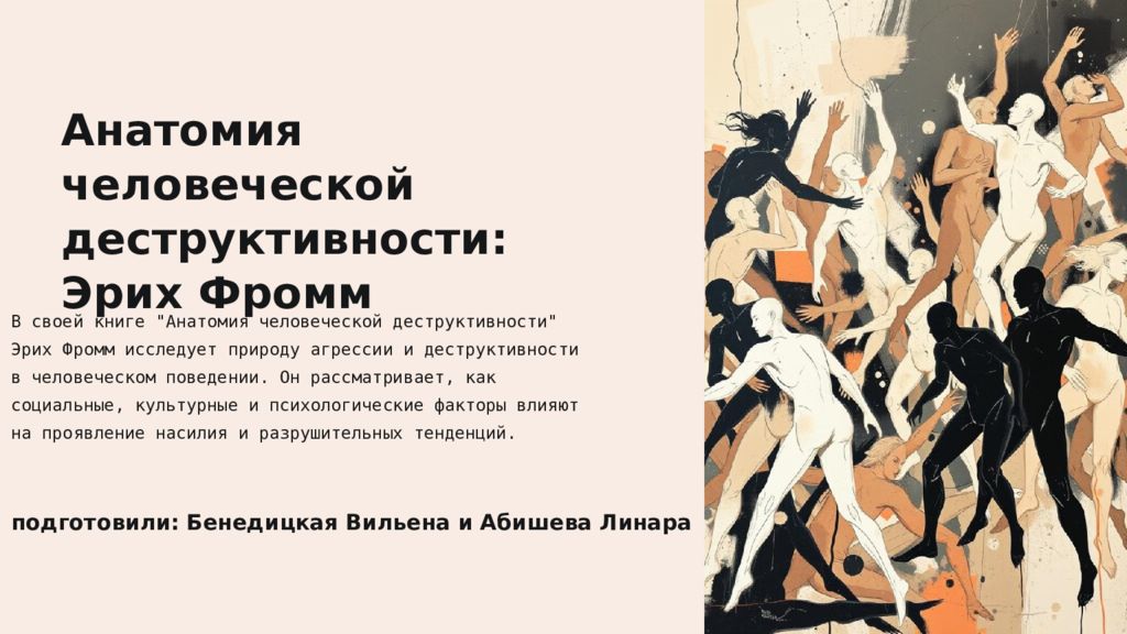 Анатомия человеческой деструктивности: Эрих Фромм В своей книге "Анатомия человеческой деструктивности" Эрих Фромм исследует природу агрессии и деструктивности в человеческом поведении. Он рассматривает, как социальные, культурные и психологические факторы влияют на проявление насилия и разрушительных тенденций. ЛА по дготовили: Бенедицкая Вильена и Абишева Линара