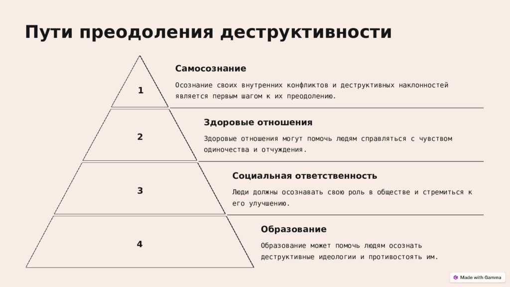 Пути преодоления деструктивности 1 Самосознание Осознание своих внутренних конфликтов и деструктивных наклонностей является первым шагом к их преодолению. 2 Здоровые отношения Здоровые отношения могут помочь людям справляться с чувством одиночества и отчуждения. 3 Социальная ответственность Люди должны осознавать свою роль в обществе и стремиться к его улучшению. 4 Образование Образование может помочь людям осознать деструктивные идеологии и противостоять им.