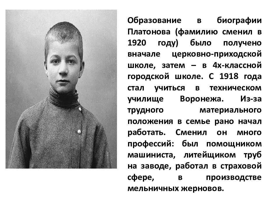 Образование в биографии Платонова (фамилию сменил в 1920 году) было получено вначале церковно-приходской школе, затем – в 4х-классной городской школе. С 1918 года стал учиться в техническом училище Воронежа. Из-за трудного материального положения в семье рано начал работать. Сменил он много профессий: был помощником машиниста, литейщиком труб на заводе, работал в страховой сфере, в производстве мельничных жерновов.