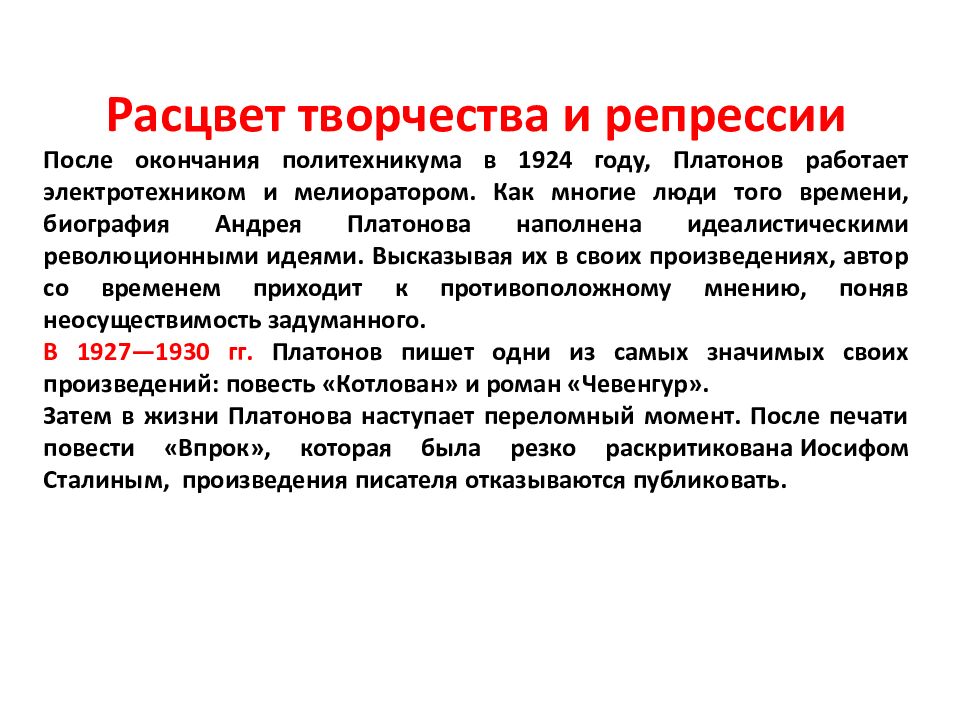 Расцвет творчества и репрессии После окончания политехникума в 1924 году, Платонов работает электротехником и мелиоратором. Как многие люди того времени, биография Андрея Платонова наполнена идеалистическими революционными идеями. Высказывая их в своих произведениях, автор со временем приходит к противоположному мнению, поняв неосуществимость задуманного. В 1927—1930 гг. Платонов пишет одни из самых значимых своих произведений: повесть « Котлован» и роман « Чевенгур ». Затем в жизни Платонова наступает переломный момент. После печати повести «Впрок», которая была резко раскритикована Иосифом Сталиным, произведения писателя отказываются публиковать.