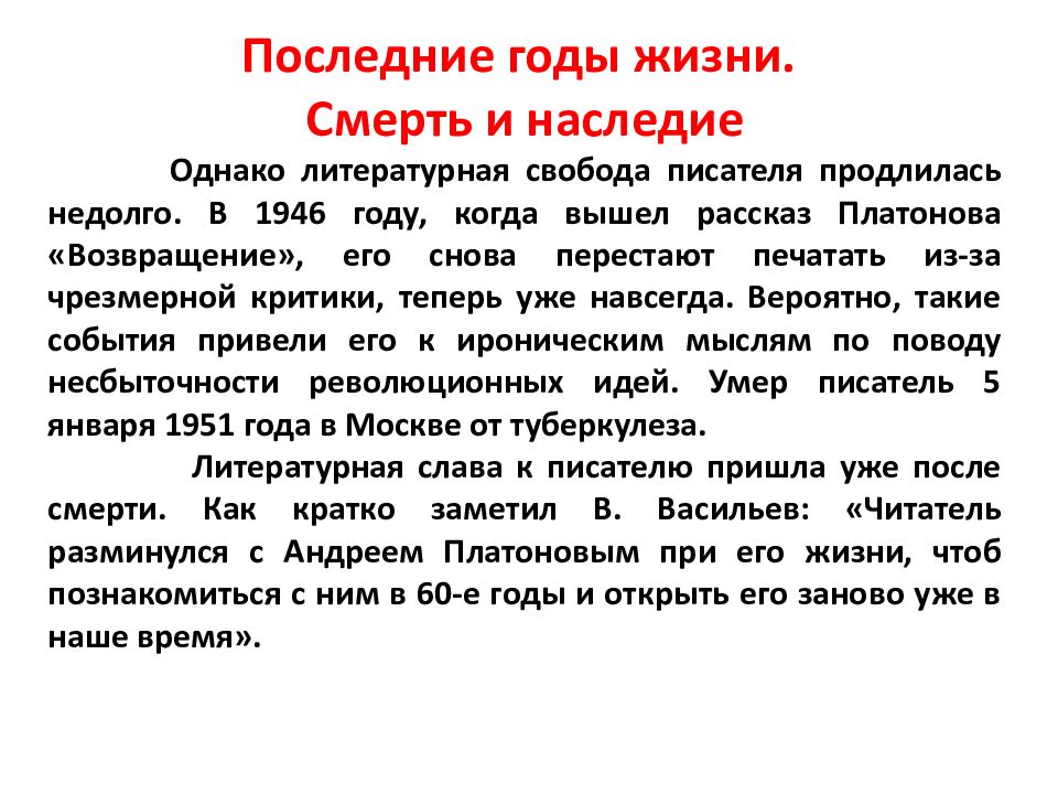 Последние годы жизни. Смерть и наследие Однако литературная свобода писателя продлилась недолго. В 1946 году, когда вышел рассказ Платонова «Возвращение», его снова перестают печатать из-за чрезмерной критики, теперь уже навсегда. Вероятно, такие события привели его к ироническим мыслям по поводу несбыточности революционных идей. Умер писатель 5 января 1951 года в Москве от туберкулеза. Литературная слава к писателю пришла уже после смерти. Как кратко заметил В. Васильев: «Читатель разминулся с Андреем Платоновым при его жизни, чтоб познакомиться с ним в 60-е годы и открыть его заново уже в наше время ».