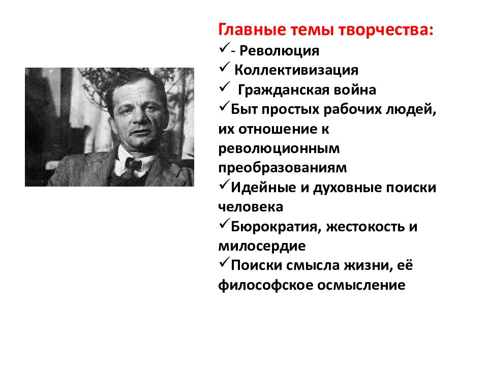 Главные темы творчества: - Революция Коллективизация Гражданская война Быт простых рабочих людей, их отношение к революционным преобразованиям Идейные и духовные поиски человека Бюрократия, жестокость и милосердие Поиски смысла жизни, её философское осмысление