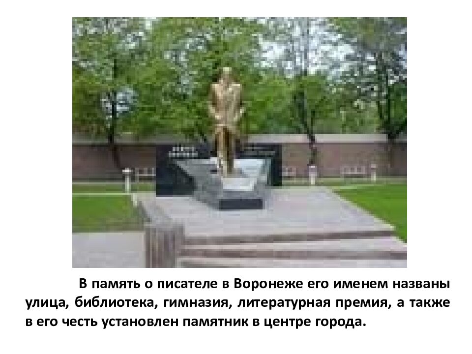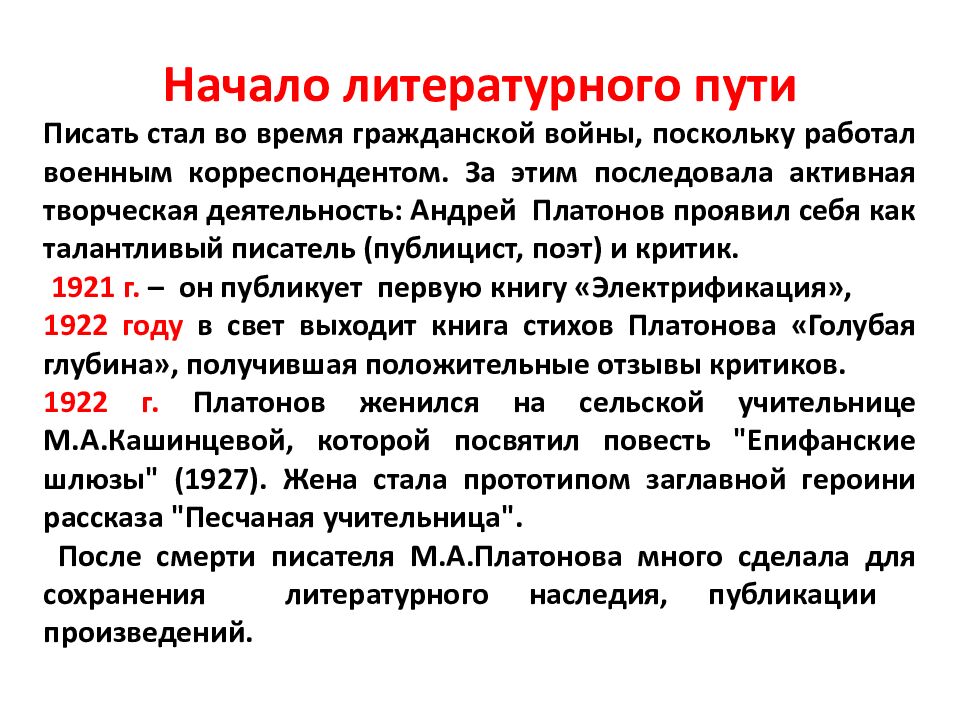 Начало литературного пути Писать стал во время гражданской войны, поскольку работал военным корреспондентом. За этим последовала активная творческая деятельность: Андрей Платонов проявил себя как талантливый писатель (публицист, поэт) и критик. 1921 г. – он публикует первую книгу «Электрификация», 1922 году в свет выходит книга стихов Платонова «Голубая глубина», получившая положительные отзывы критиков. 1922 г. Платонов женился на сельской учительнице М.А.Кашинцевой, которой посвятил повесть " Епифанские шлюзы" (1927). Жена стала прототипом заглавной героини рассказа "Песчаная учительница". После смерти писателя М.А.Платонова много сделала для сохранения литературного наследия, публикации произведений.