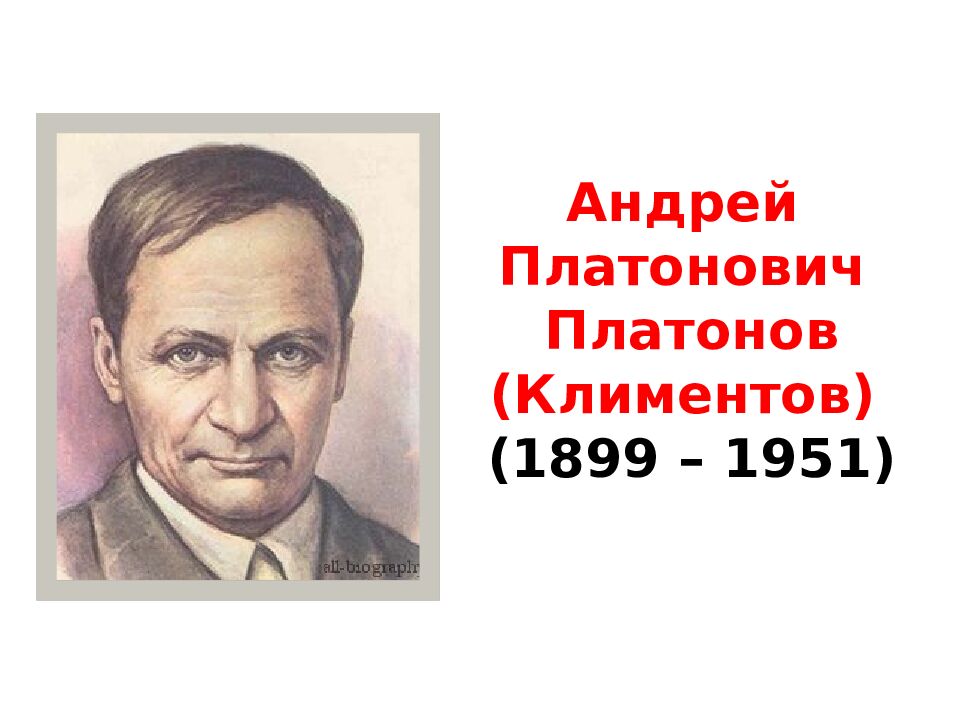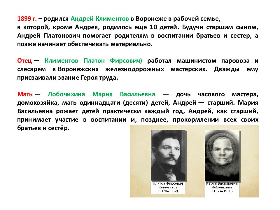 1899 г. – родился Андрей Климентов в Воронеже в рабочей семье, в которой, кроме Андрея, родилось еще 10 детей. Будучи старшим сыном, Андрей Платонович помогает родителям в воспитании братьев и сестер, а позже начинает обеспечивать материально. Отец — Климентов Платон Фирсович ) работал машинистом паровоза и слесарем в Воронежских железнодорожных мастерских. Дважды ему присваивали звание Героя труда. Мать — Лобочихина Мария Васильевна — дочь часового мастера, домохозяйка, мать одиннадцати (десяти) детей, Андрей — старший. Мария Васильевна рожает детей практически каждый год, Андрей, как старший, принимает участие в воспитании и, позднее, прокормлении всех своих братьев и сестёр.