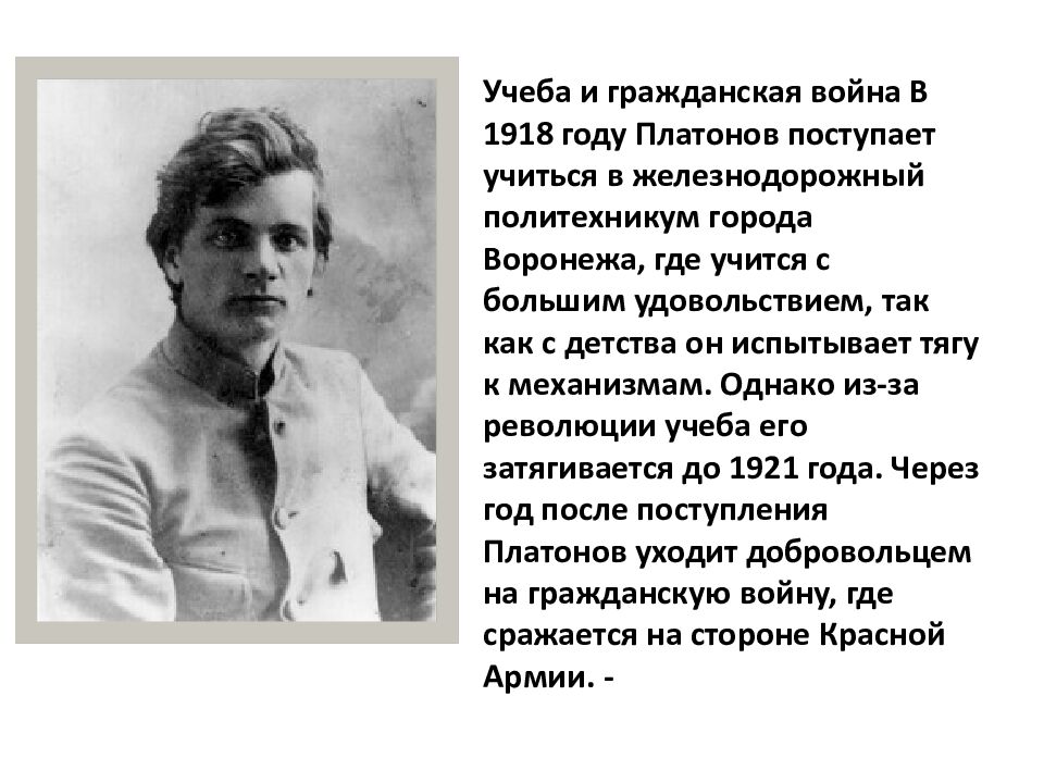 Учеба и гражданская война В 1918 году Платонов поступает учиться в железнодорожный политехникум города Воронежа, где учится с большим удовольствием, так как с детства он испытывает тягу к механизмам. Однако из-за революции учеба его затягивается до 1921 года. Через год после поступления Платонов уходит добровольцем на гражданскую войну, где сражается на стороне Красной Армии. -